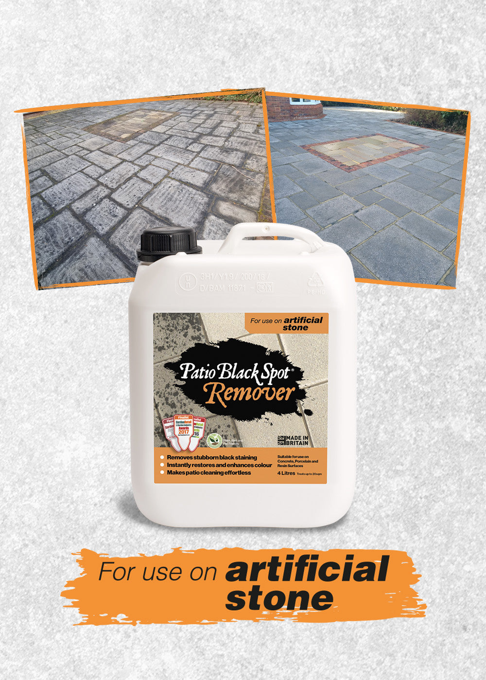 Patio Black Spot Remover is currently the only product developed specifically to safely remove black spot staining and restore the natural colour to garden stonework. Patio Black Spot Remover for Artificial Stone will remove organic staining from all types of concrete and artificial paving.