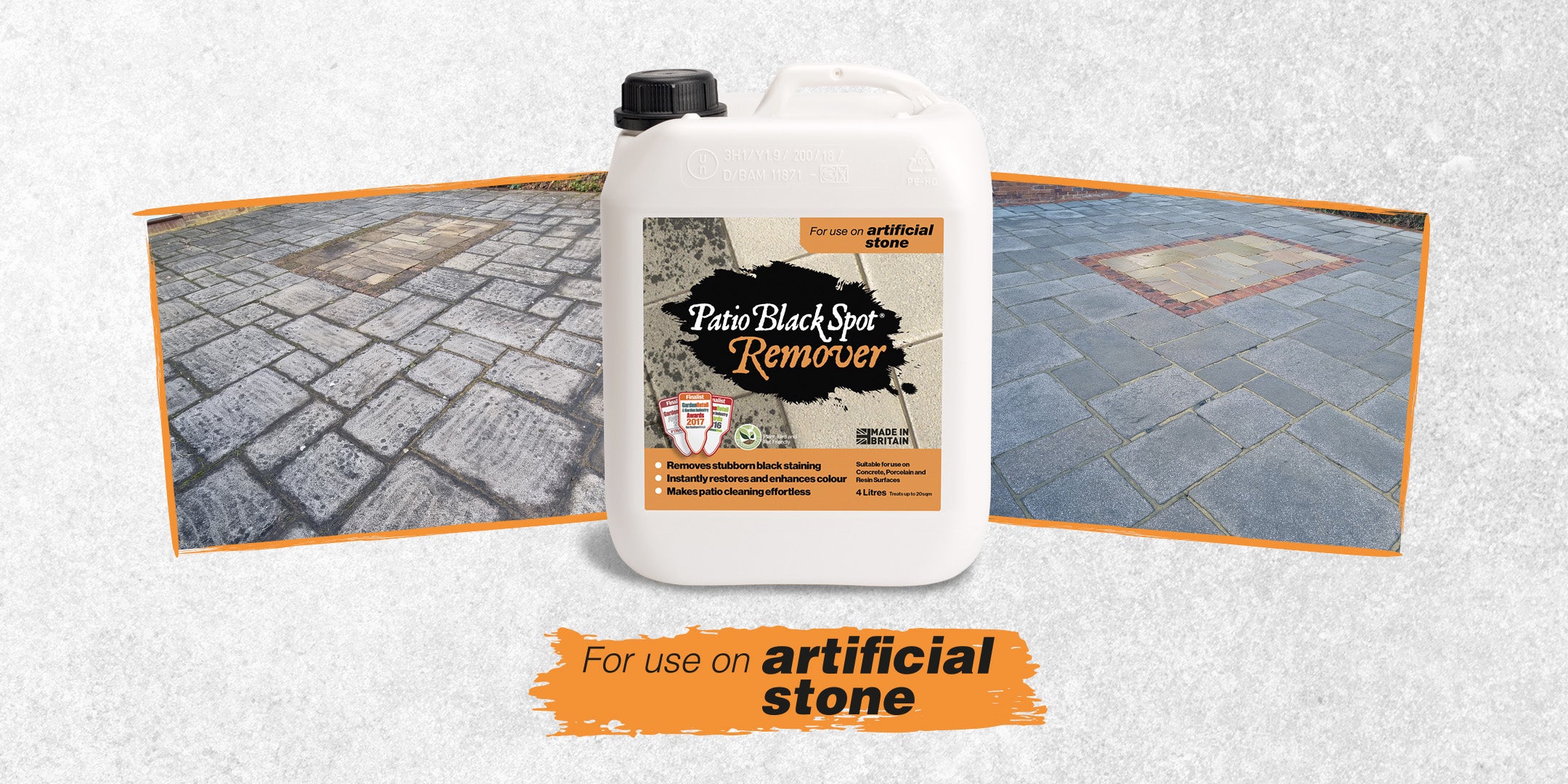 For use on manufactured slabs such as Marshalls, Bradstone and Haddonstone, Including all precast patio slabs. Patio Black Spot Remover for Artificial Stone is also suitable for concrete paving slabs, porcelain, resin driveways and composite decking.